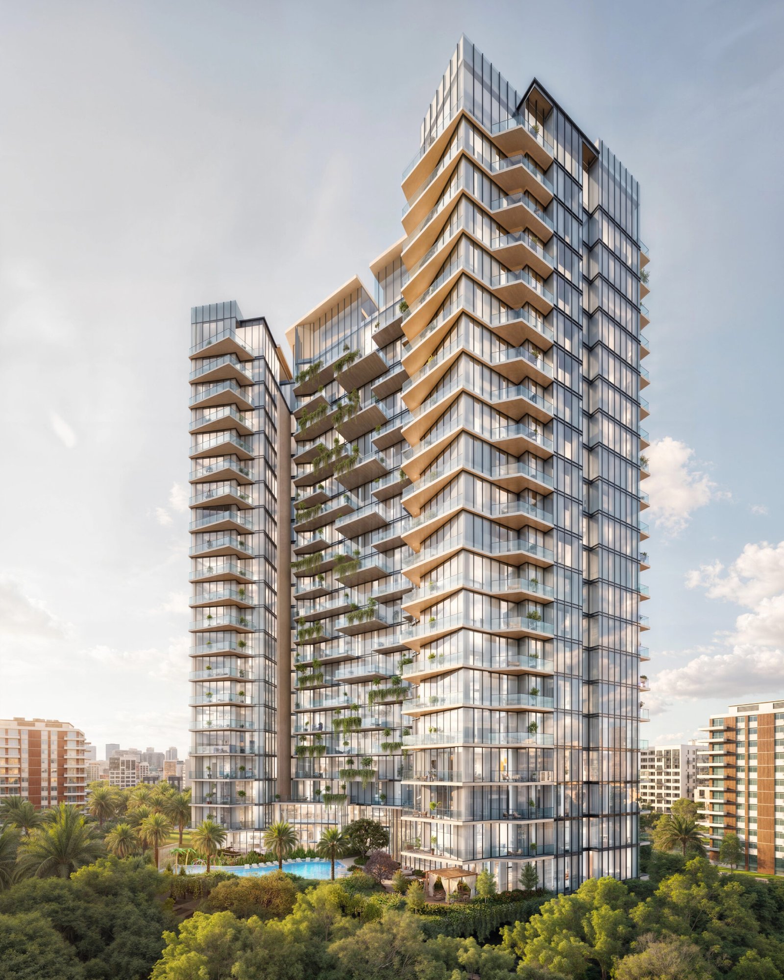 Arjan. The tower’s floor-to-ceiling glazing maximizes daylight and frames uninterrupted views of gardens and the skyline. Its clean geometry, guided by subtle Japanese references, establishes a rhythm of balance and calm.